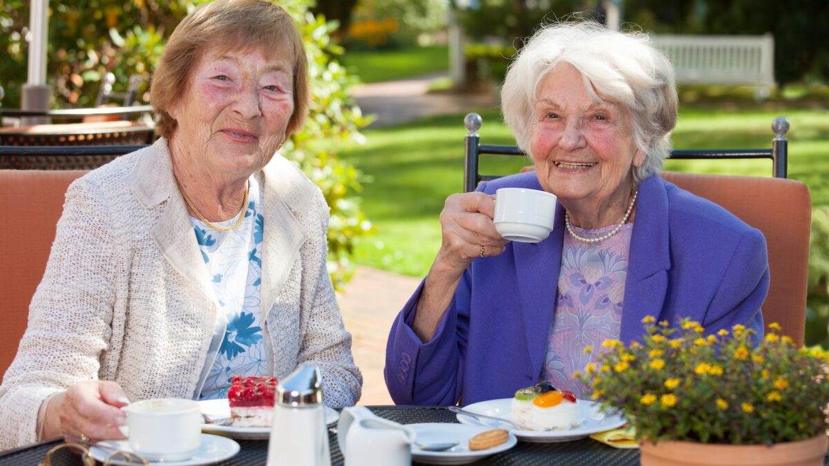 Close up Two Happy Senior Women Looking at the Camera While Having Coffee Time at the Garden Table.